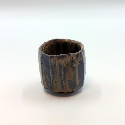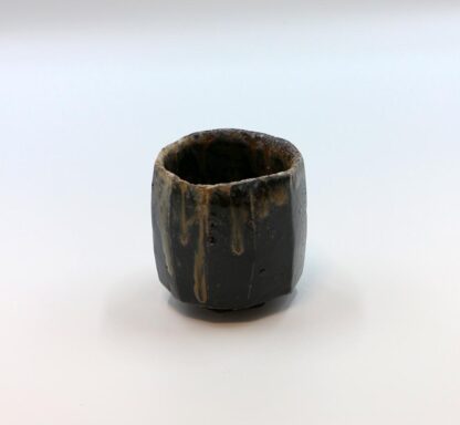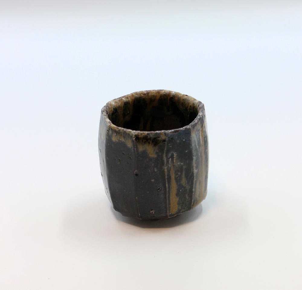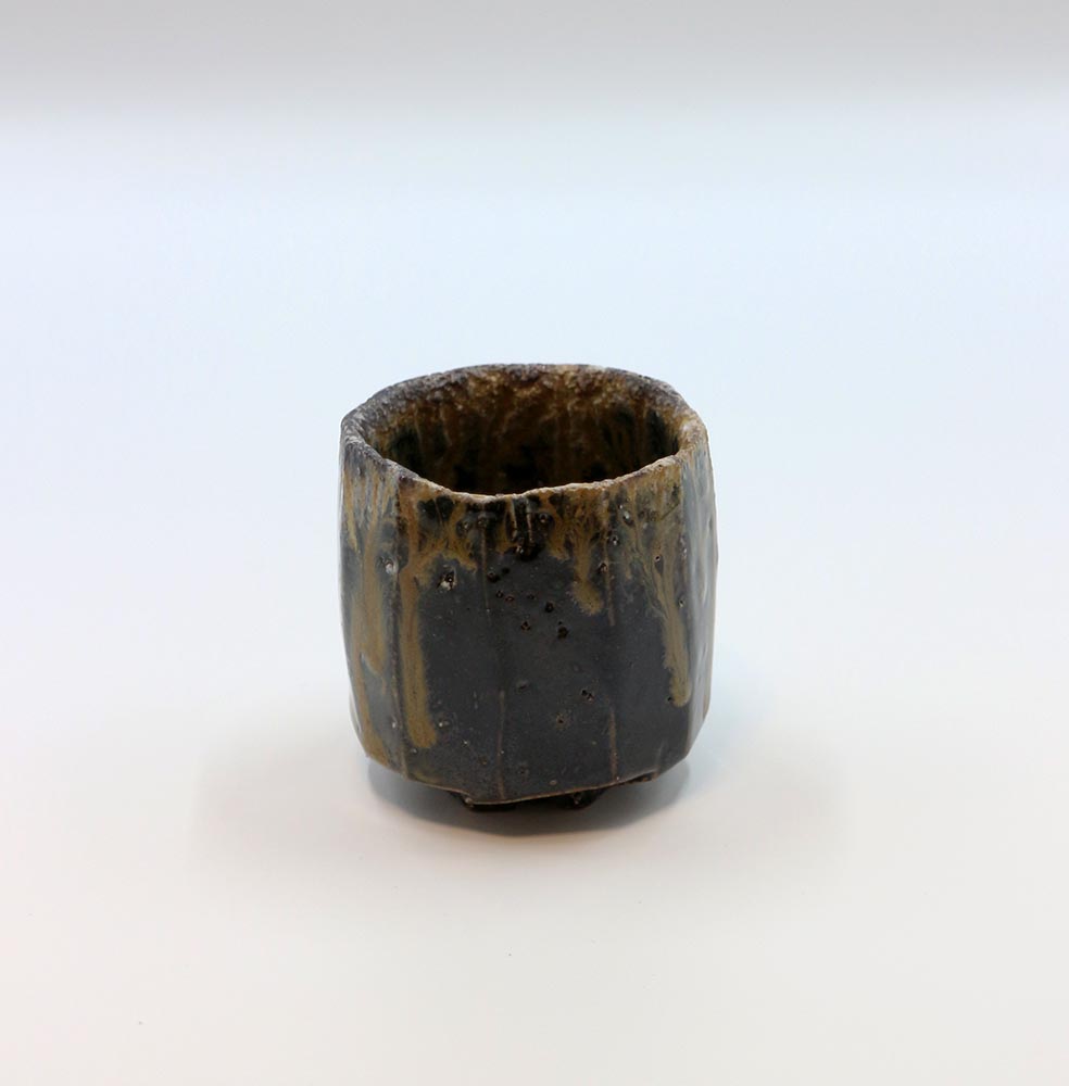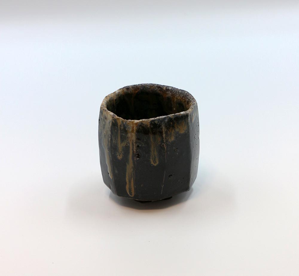 伊部手と呼ばれる黒い肌を持つぐい呑みで,面取のシャープな造形に,滝の流れを思わせる玉簾の胡麻がよく調和した作品です。