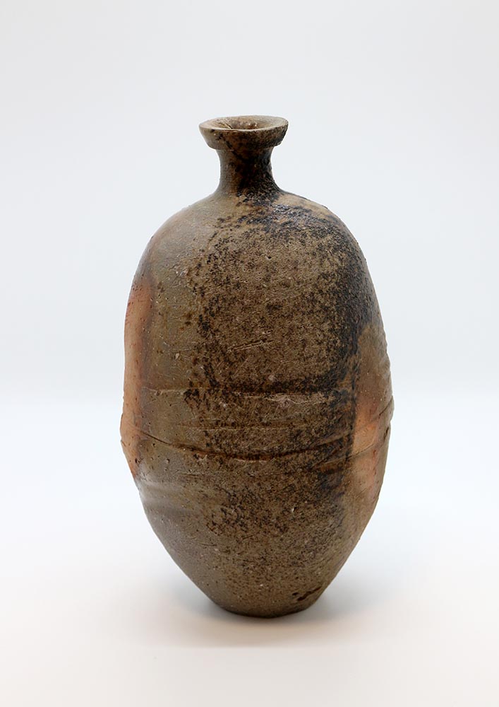 サイズ的には花入として用いられる事が多い芋徳利と呼ばれる大振りな作品で,伝統的な造形に削りと胴締めのラインがあしらわれ,作家らしいシャープでモダンな雰囲気を纏っている一点です。