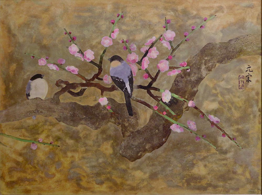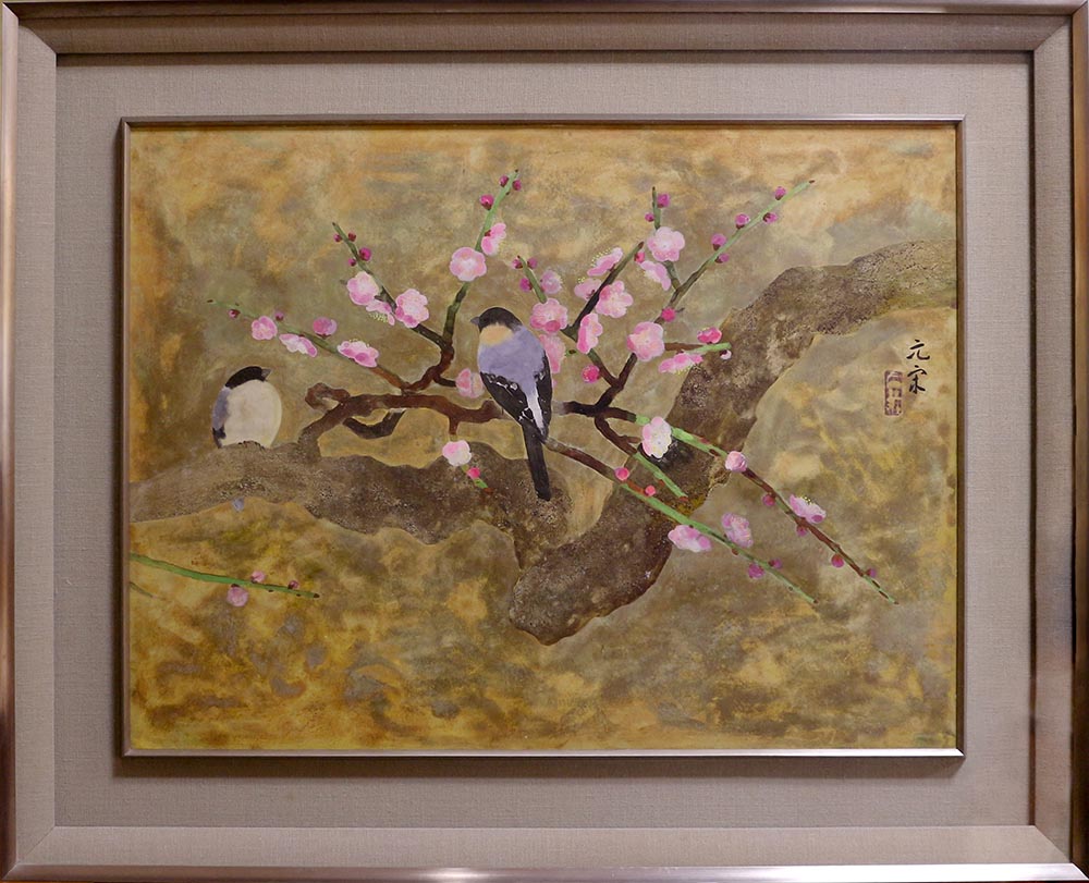 1960年代頃の作かと思われますが,紅梅が咲くの木の枝に二羽の鷽が佇む構図で,古木の歴史を感じさせる肌の重厚な質感と,対照的に梅の花が咲く枝や小鳥の生命感が巧く調和している作家のこの時期らしい作品です。