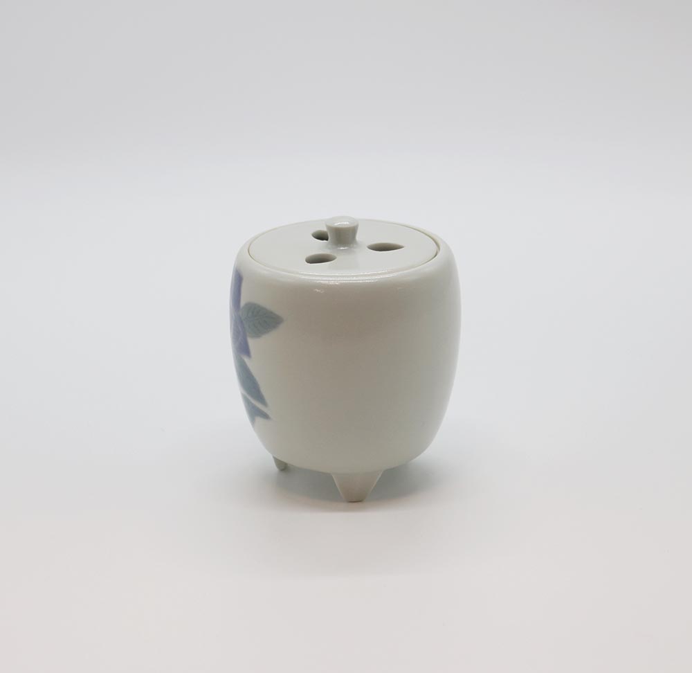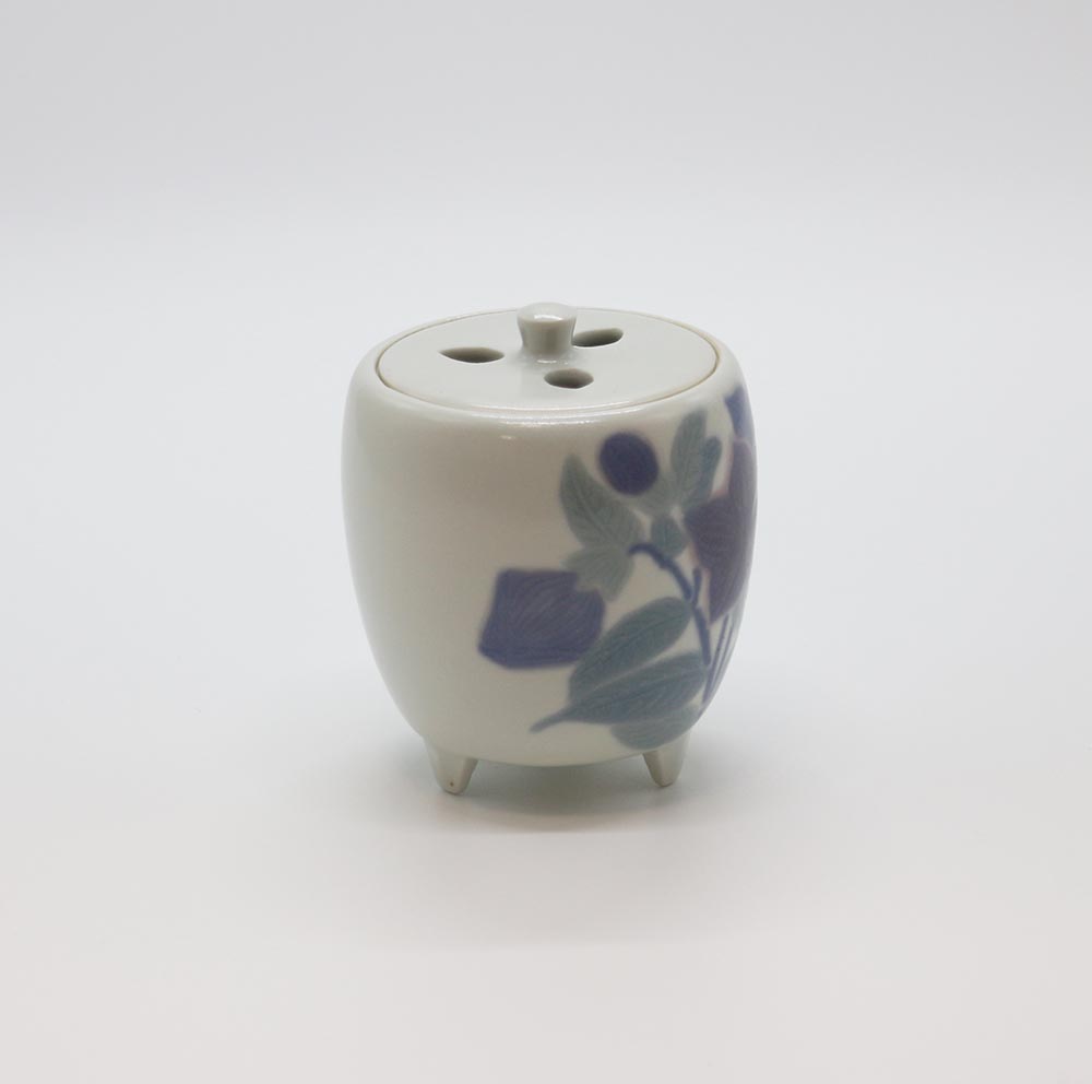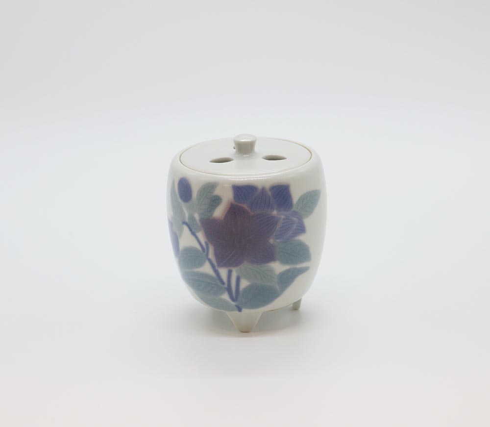 作家の得意とする彩磁の技法を用いた香炉で,彩磁独特の柔らかな色彩で桔梗の花の凛とした姿が見事に表現されています。
