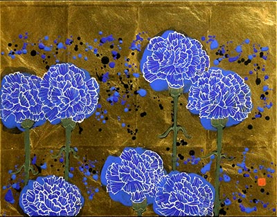 金の箔押した画面に青のカーネーションを描いた一枚で,鮮やかな背景に作家独特の青で描かれたカーネーションが良く映えた作品です。