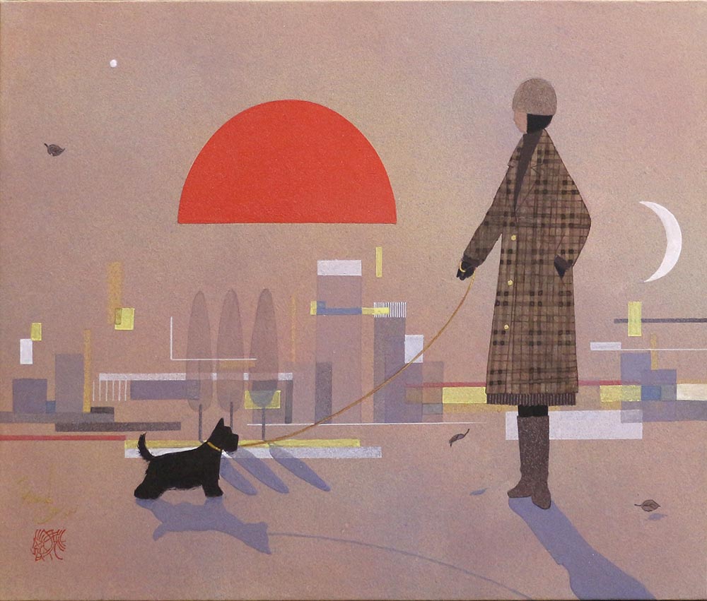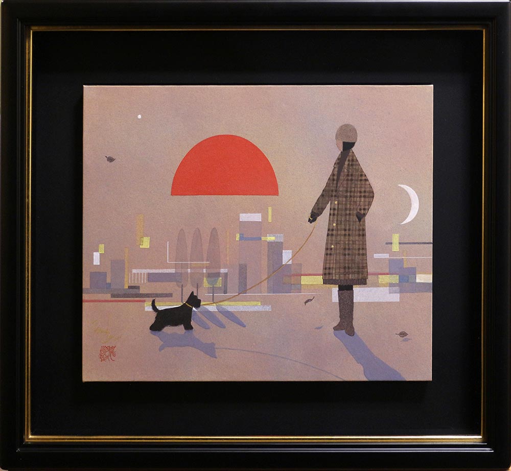 日暮れの街を背景に佇む,チェックの衣装を纏った女性と黒いテリアの姿が,見る物を物語の一場面にいるような気にさせてくれる一枚です。