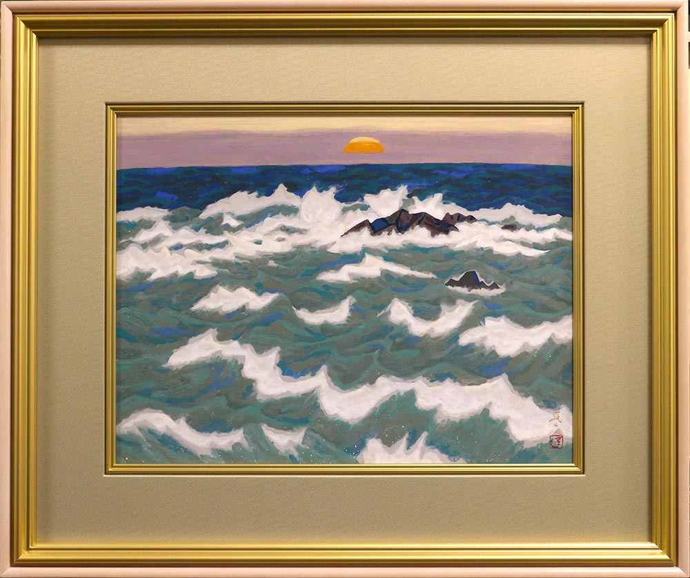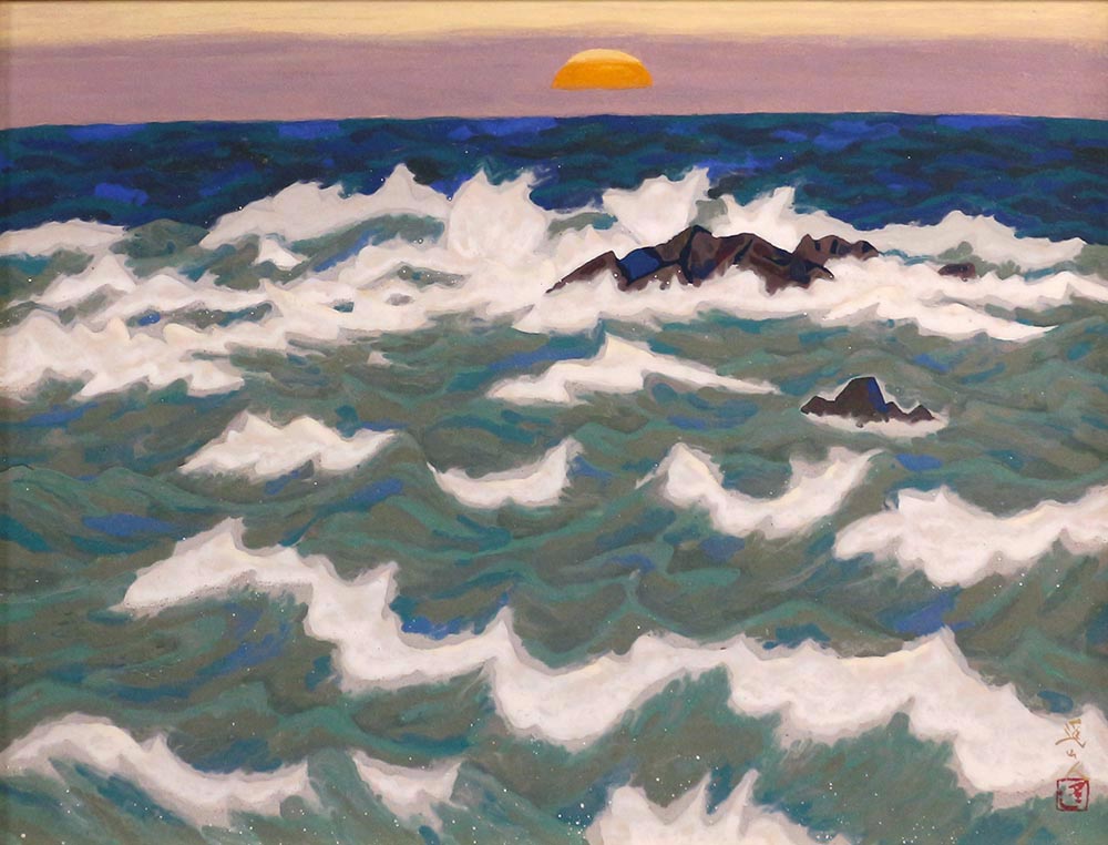 遙邨後期の海の風景を描いた作品で,白波の打ち付ける手前の岩礁と,水平線の向こうから静かに昇ってくる朝日の対比が見事な,遙邨らしい一枚です。