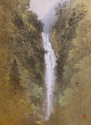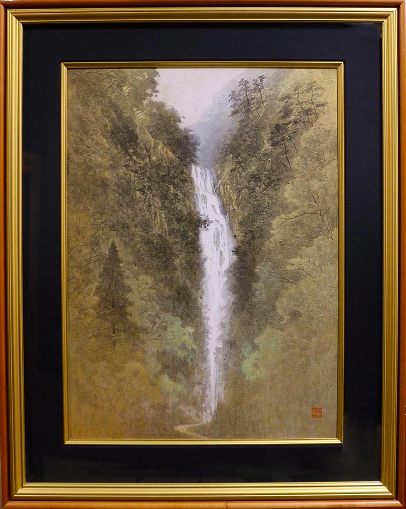 岡山県北部の真庭市にある名瀑・神庭の滝を描いた一枚で,切り立った谷間から一気に流れ落ちる水のダイナミックな姿を,抑えた色調で丁寧に描いた作家らしい一枚です。