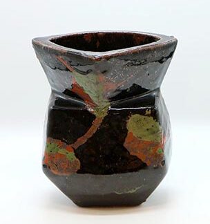 岐阜県の重要無形文化財でもある陶芸家・玉置保夫の花入れです。長方形の断面を持つ面白い造形の花入れで,紅く発色した釉薬と力強く刻まれた櫛目が良いマッチングを見せる一点です。
