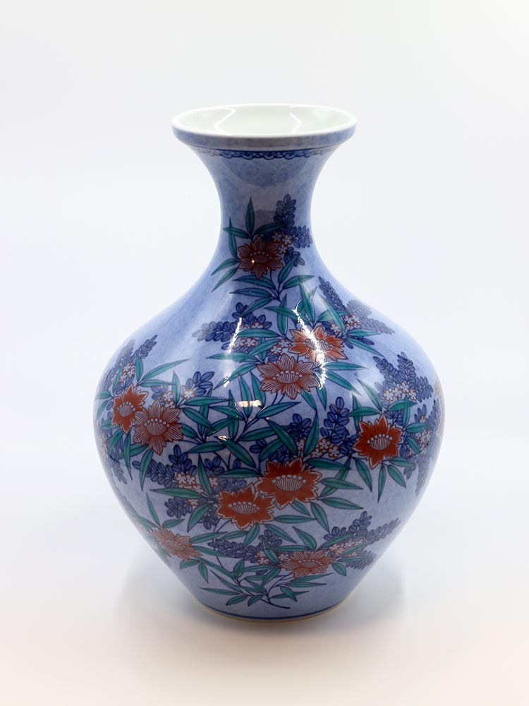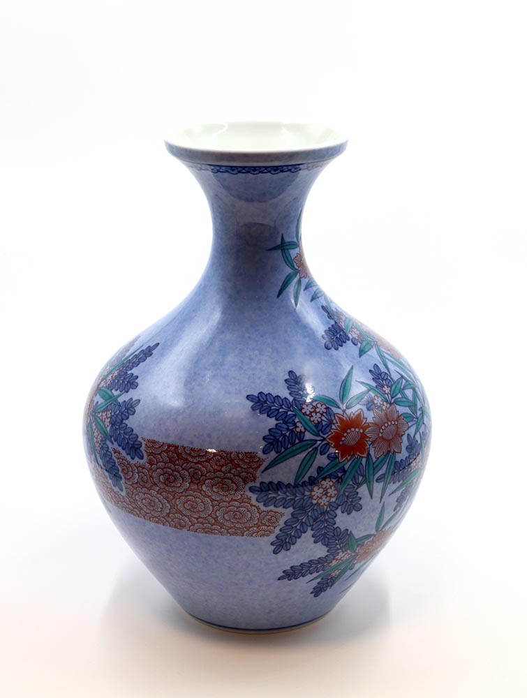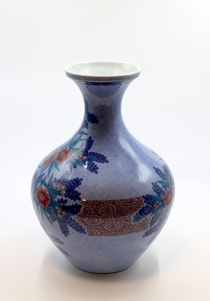 鍋島の伝統的な様式に十三代が取り入れた吹き墨の技法を組み合わせた作品で,薄い藍色を基調とした肌に濃い赤・緑・紺で草花文をあしらった今右衛門らしい一点です。