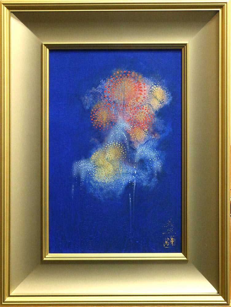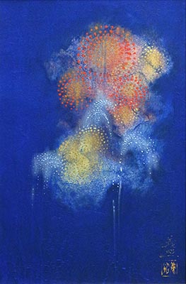 野村義照の象徴的なブルーの色彩の背景に,花火を描いた一枚でシンプルでありながら心に残る余韻を感じさせる一枚です。