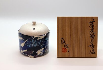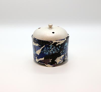コントラストのはっきりとした白・黒・青・緑などの土を混淆した鮮やかな色彩の香炉で,緑の部分が楓の若葉を思わせる色彩におり銀の火屋と相まって華やかな雰囲気の一点です。