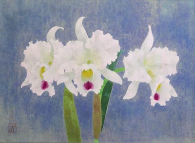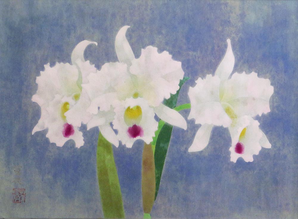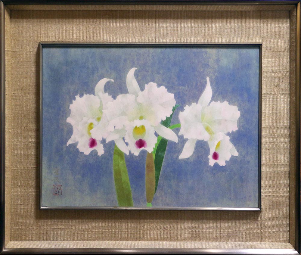 作家の晩年期のカトレアの花を描いた作品で,丁寧に描かれた背景から浮き上がるように表現された白い花の存在感が際立った一枚です。