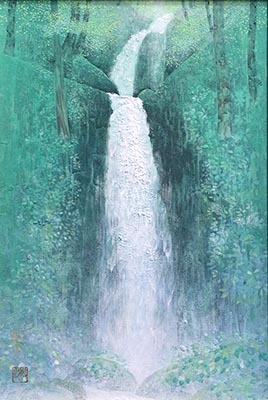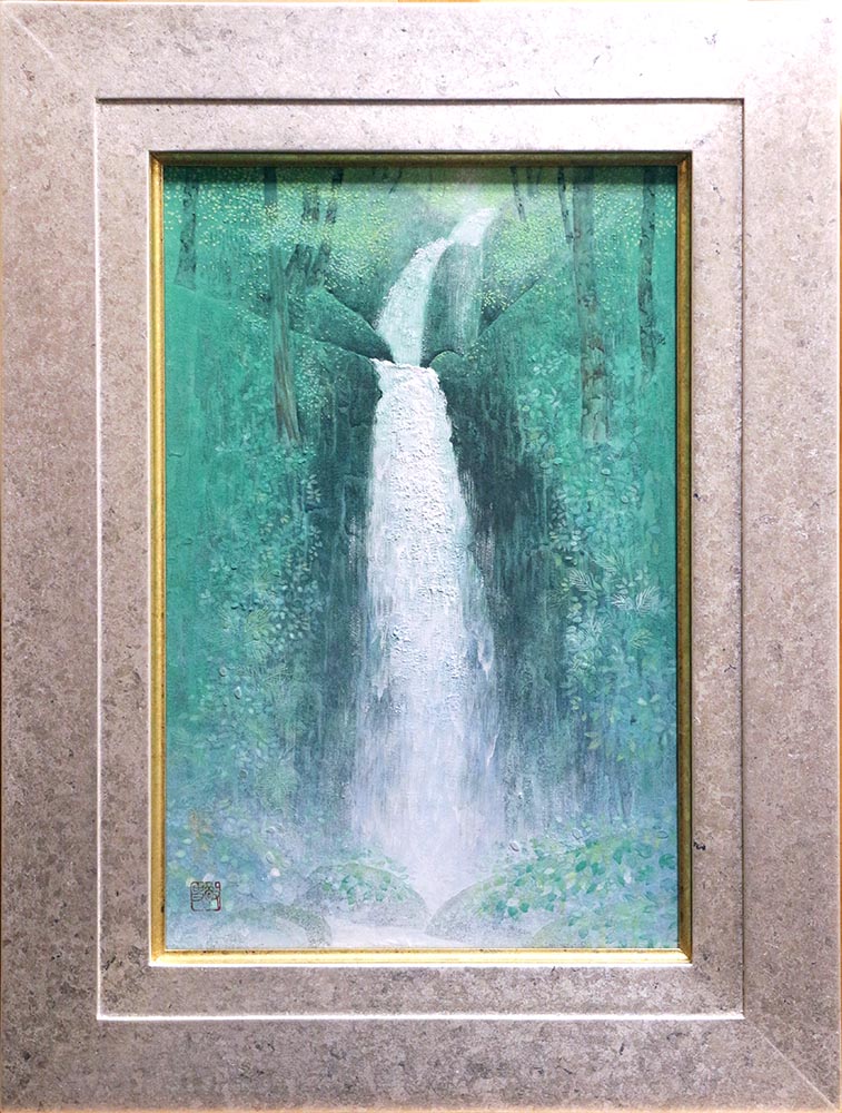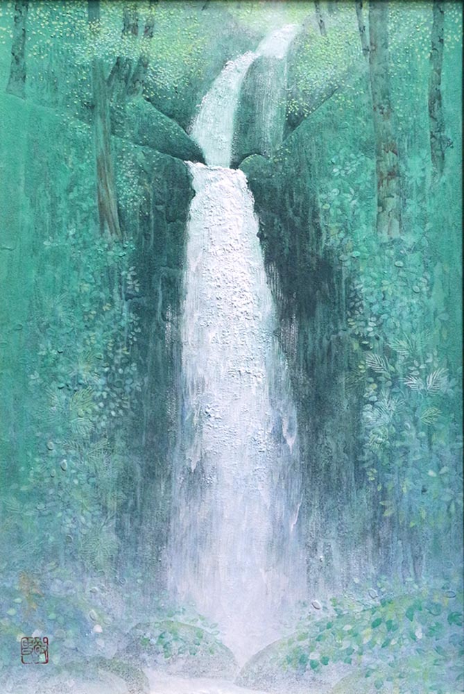 令和3年に青森県・奥入瀬の雲井の滝を描いた作で,渓谷の深い緑の中を白く流れ落ちる滝の姿を,丁寧に描いた清涼感溢れる一枚です。