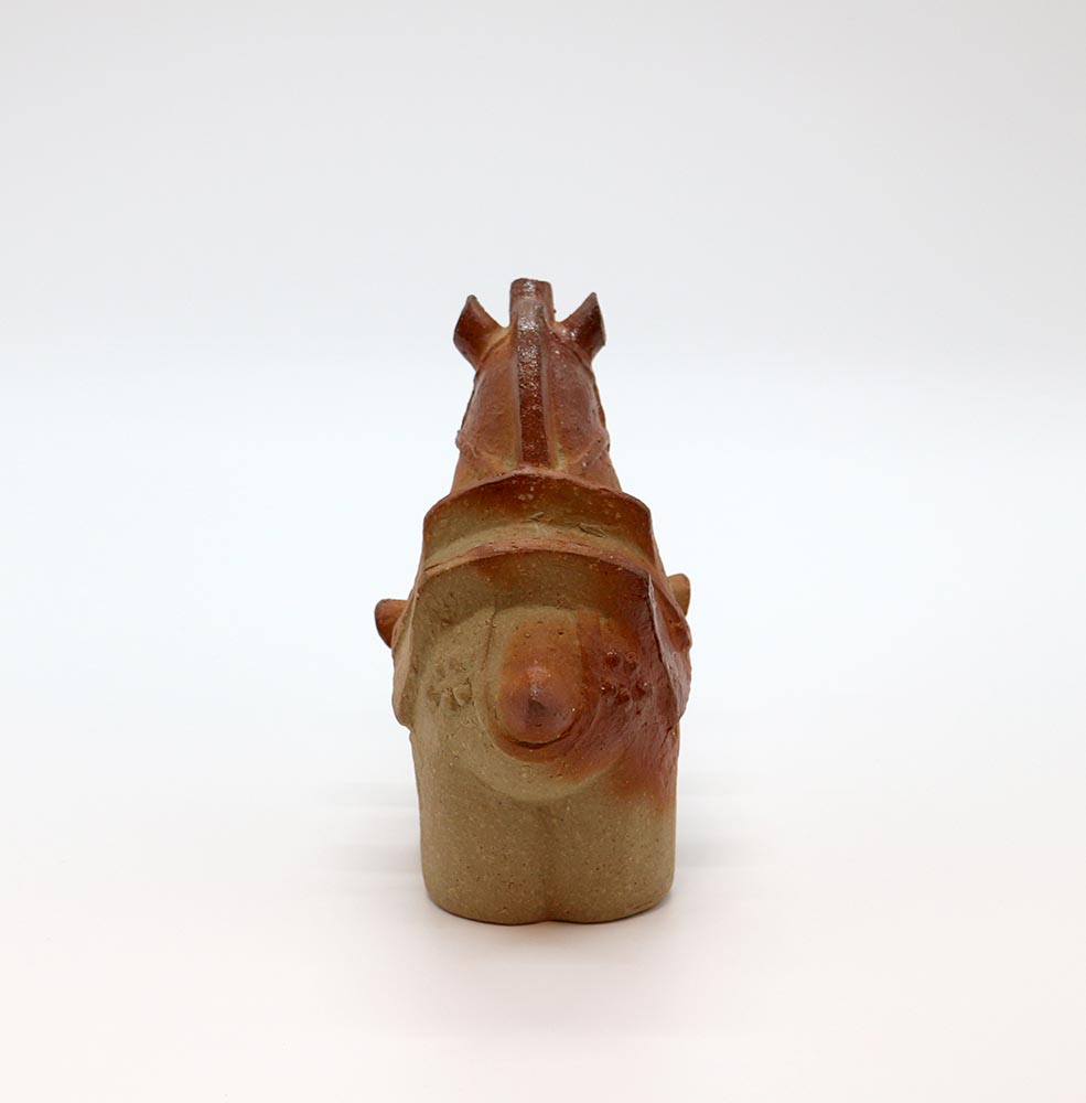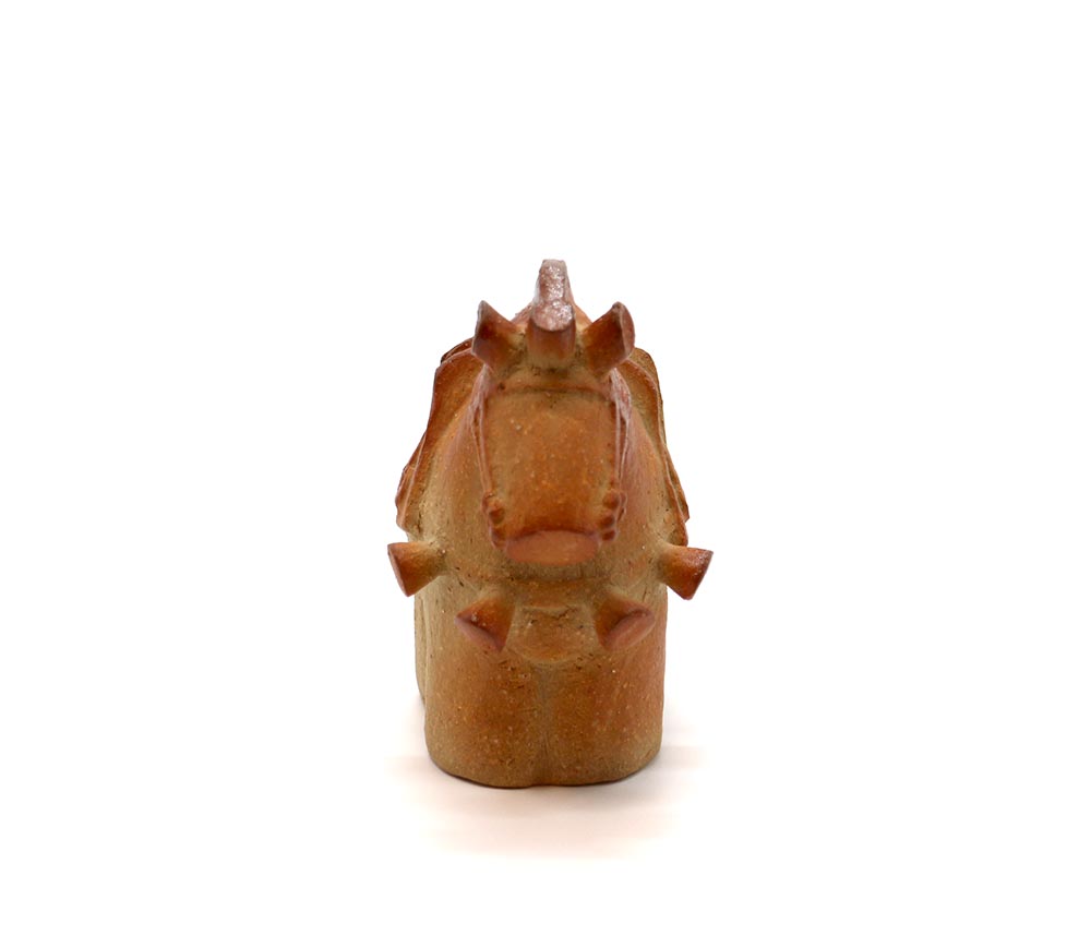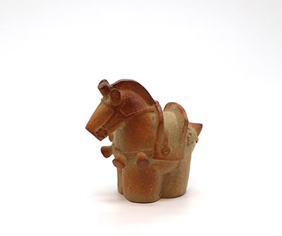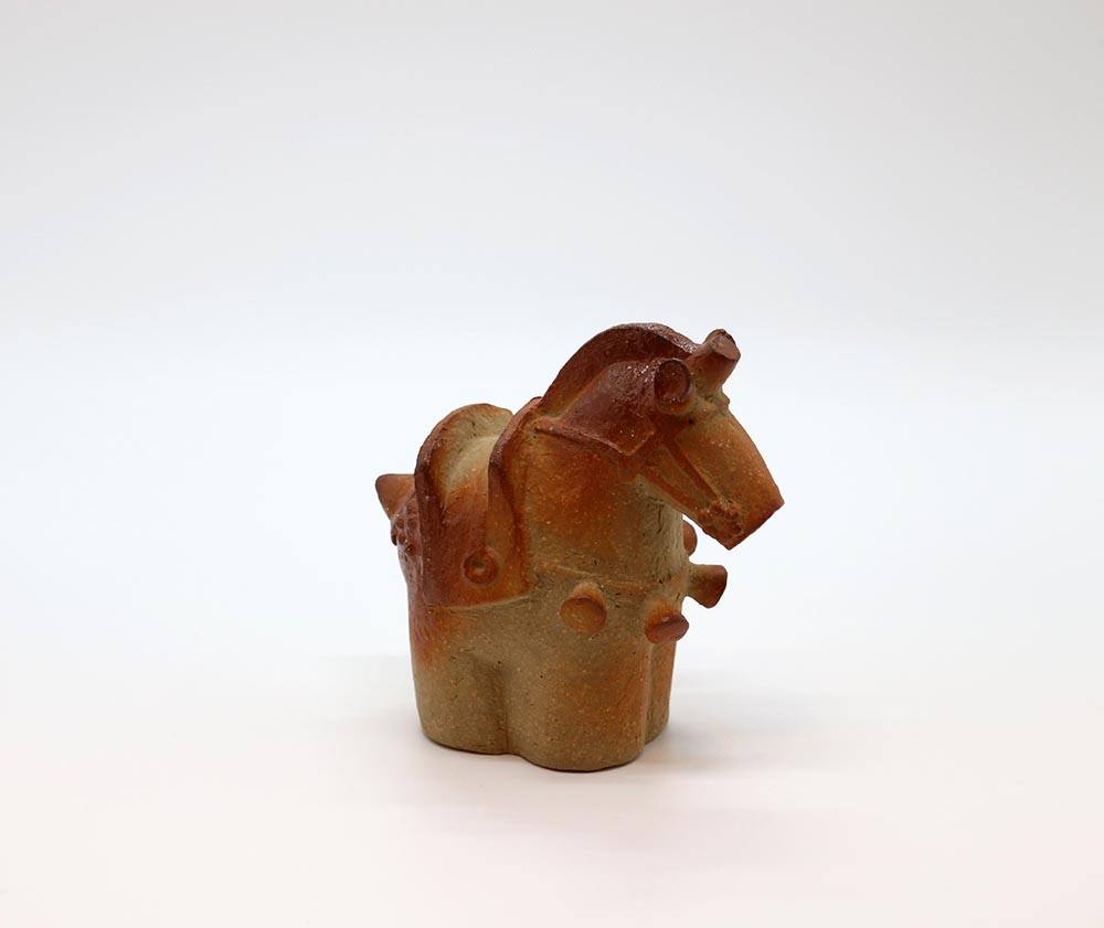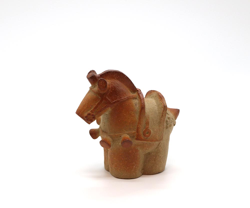 埴輪の馬をイメージさせる面白い形の馬で,緋襷の濃い緋色の焼けが造形とよく調和している一点です。