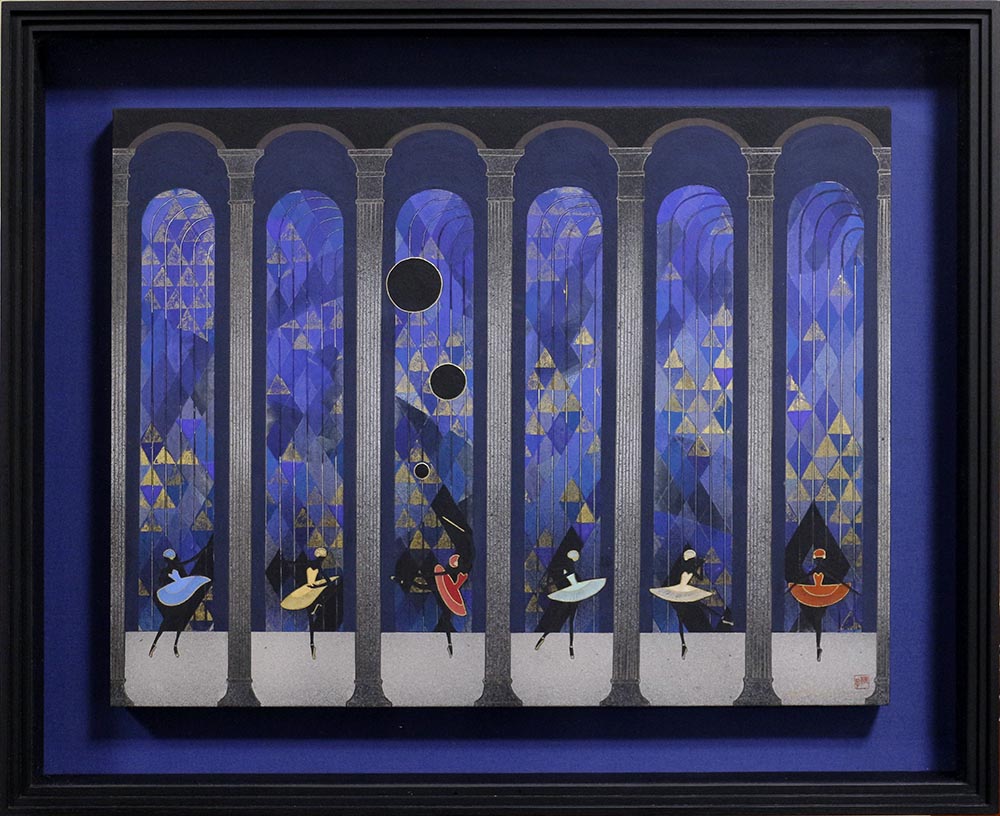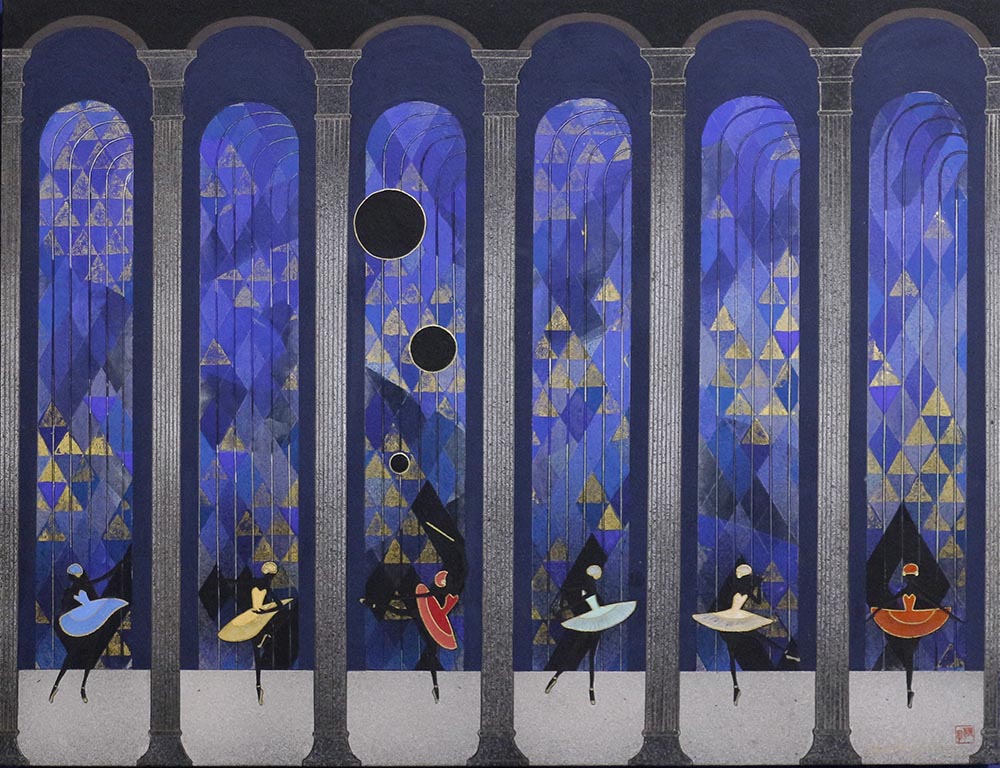 バレエの6人による踊り,パ・ドゥ・シスと名付けられた一枚で,柱で区切られた舞台で6人のバレリーナが踊る姿が描かれていて,モダンでシックな雰囲気が魅力的です。